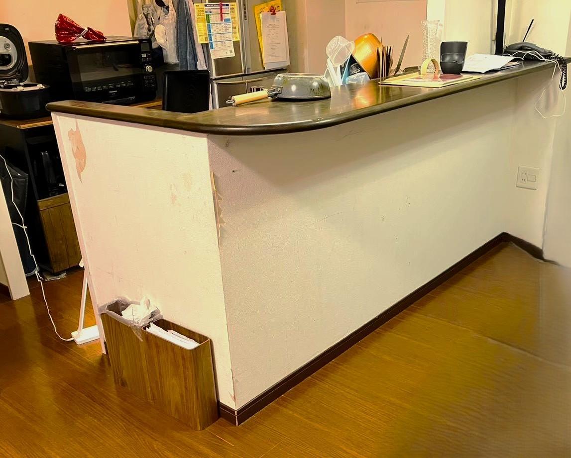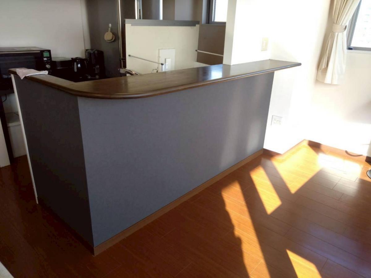 2026年1月施工 工事後:LDKのフローリングリフォームと、キッチン カウンターのクロス貼替え後です。 空間全体を引き締める、上質でシャープなクロスと フローリングの色味をお選びいただきました。